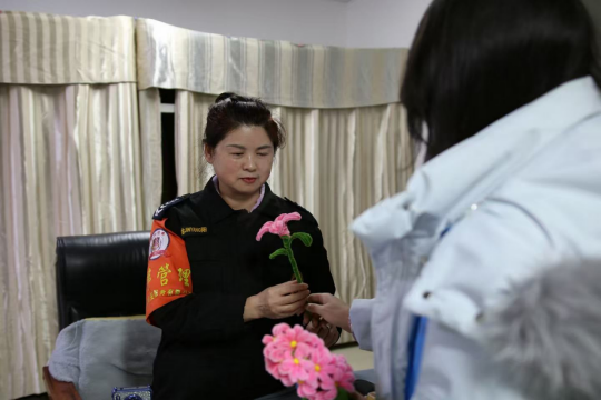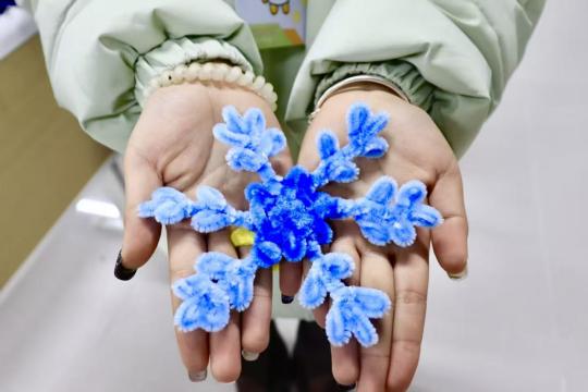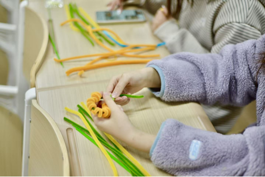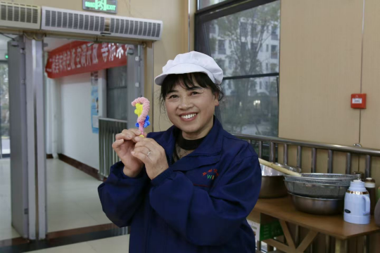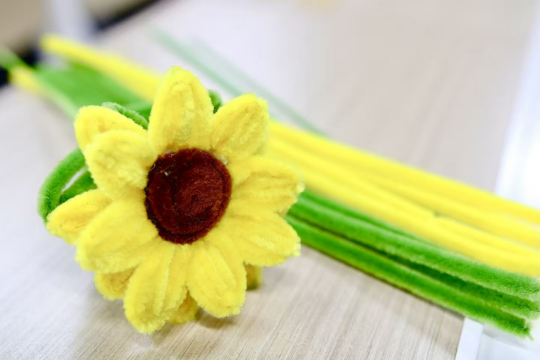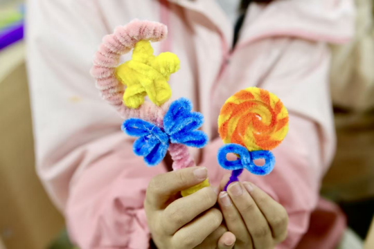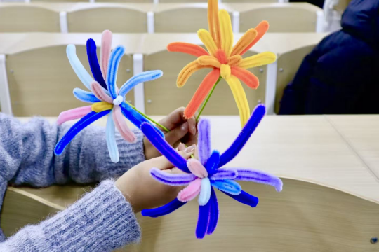 在线下活动主会场一教学楼304教室内,“以物寄情”手工坊正如火如荼地展开。同学们执起五彩斑斓的扭扭棒,以指间温度唤醒材料生命力——盘绕、扭转、塑形,平凡的素材在巧手中渐次绽放。 每一朵手工花卉都凝结着独特的情感密码:给食堂阿姨的向阳向日葵,为宿管老师制作的康乃馨花束,献给保安大叔的剑兰花艺......这些承载着真挚谢意的作品,即将开启它们的温情之旅。