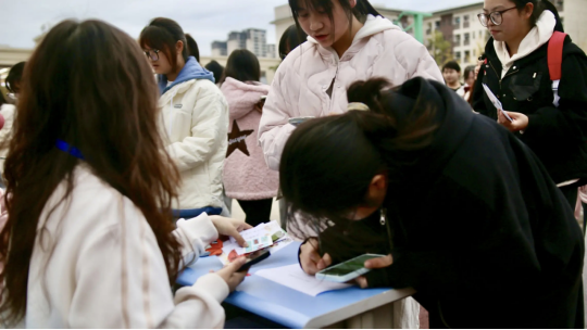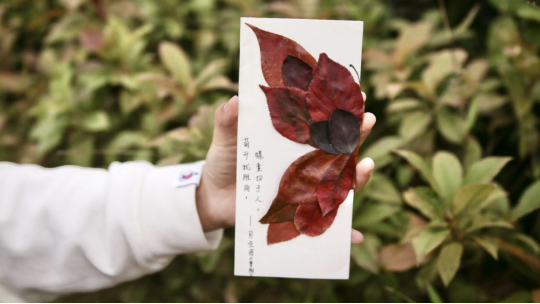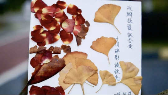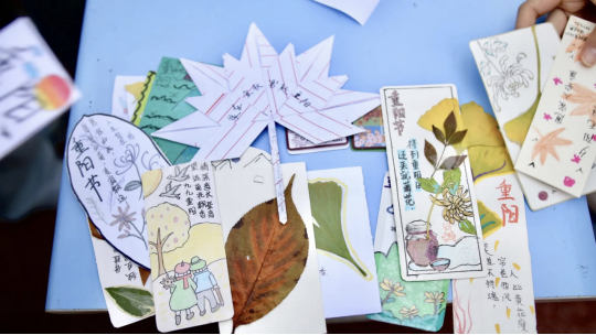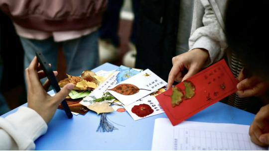活动现场秋意盎然:一份份独具匠心的手作引来过路人阵阵称赞——或是以银杏叶为笺,题写"残瓣凝霞银杏黄,叶间碎影锁秋光"的诗意书签;或是以水墨晕染出"遥知兄弟登高处"的装饰画卷,无不寄托着同学们的秋思情怀。